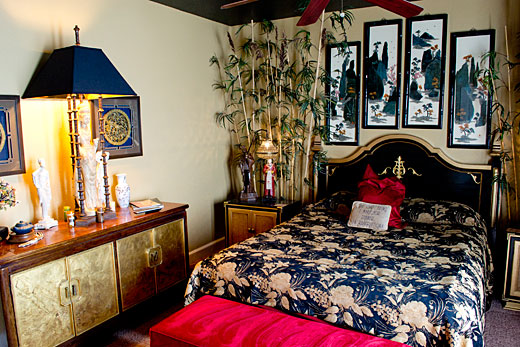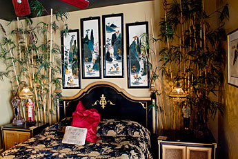 Designed using the natural harmony of feng shui, this room invokes the peace and serenity of the Far East. Gold colored walls and a midnight black ceiling contrast this room’s beautiful works of asian art. Exclusive to this room is an intimate private patio complete with water fall water feature and an asian koi fish pond. Click on each image to view the larger.