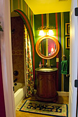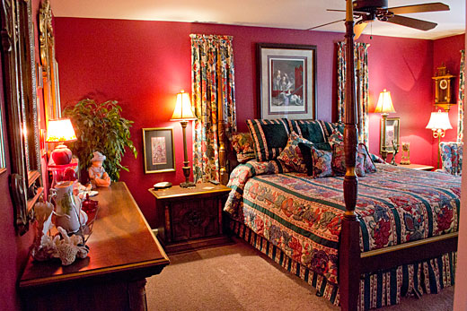 This room was designed with old world charm in mind. It is done in Waverly fabrics with brilliant reds, greens and blues, with hints of gold on a cream background. This room features an old world, wheat carved, cherry wood, four post king size bed, while Hunter prints and paintings contrast the ruby red walls. Click on each image to view the larger.
